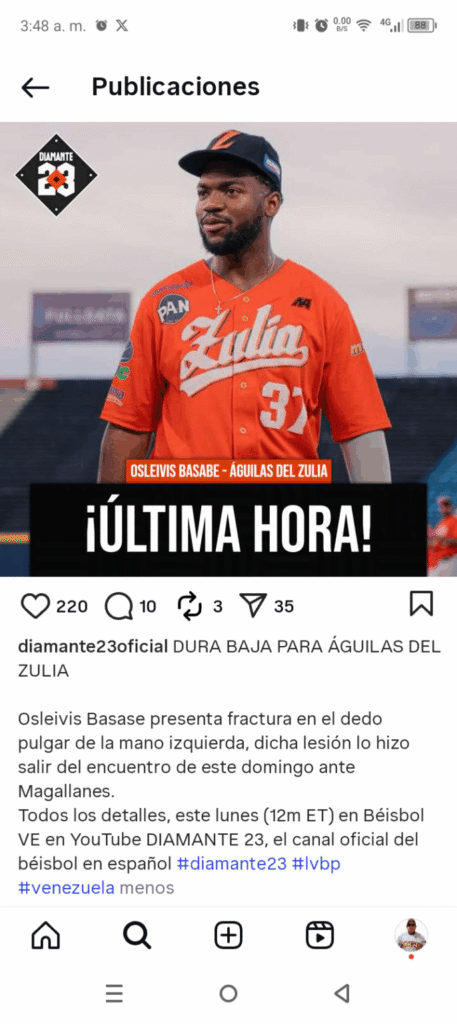 Este domingo las Águilas del Zulia además de haber caído ante Navegantes del Magallanes 8 a 1 también recibieron una noticia, no muy alentadora de su primera base, Osleivis Basabe.