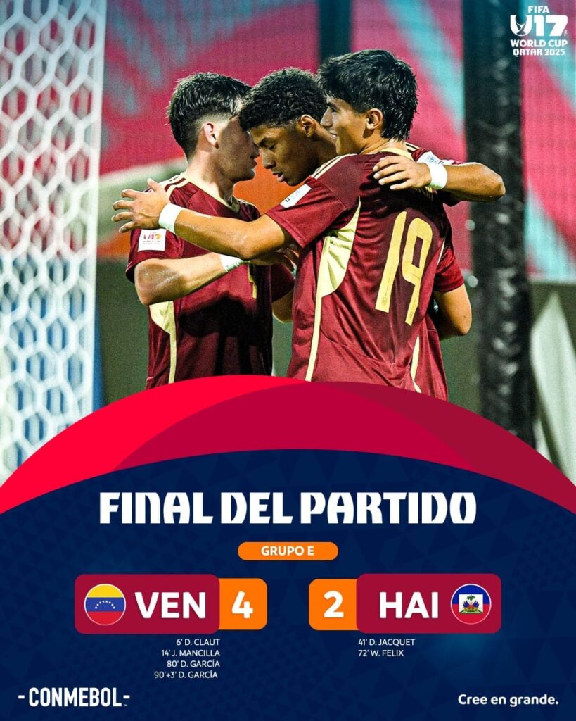 Con la victoria, su segunda del torneo, la Vinotinto juvenil llegó a 7 puntos y terminó a la cabeza del grupo E, por encima de Inglaterra (6), Egipto (4) y Haití (sin unidades).