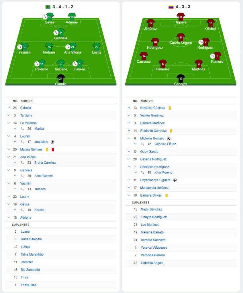Tras esto, Venezuela creció en su juego y capitalizó su dominio con los goles de Romero e Higuera. Jaqueline Ribeiro emergió del banco de suplentes para anotar el descuento de Brasil, pero solo quedaban cinco minutos del tiempo reglamentario y las de Belli supieron defender la ventaja para conseguir una conquista histórica, que le ayuda a reafirmar confianza y ánimos de cara a los compromisos que se le avecinan.