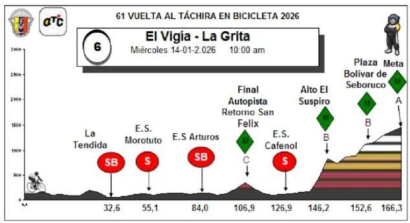 Y llega justo antes de una de las etapas claves de la competencia, la sexta del itinerario, con recorrido de 166 kilómetros entre El Vigía y el temido ascenso hacia La Grita, que contempla paso por cuatro puertos montañosos, uno de ellos de primera categoría en la meta.