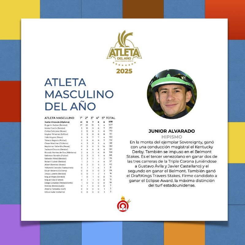 Alvarado recibió un reconocimiento de la prensa nacional que en 2023 le fue esquivo a su colega Javier Castellano, que también festejó en dos de las tres grandes de la hípica de Estados Unidos, pero perdió la votación de ese año frente a Ronald Acuña y su inédito logro de 40 jonrones y 70 bases robadas.