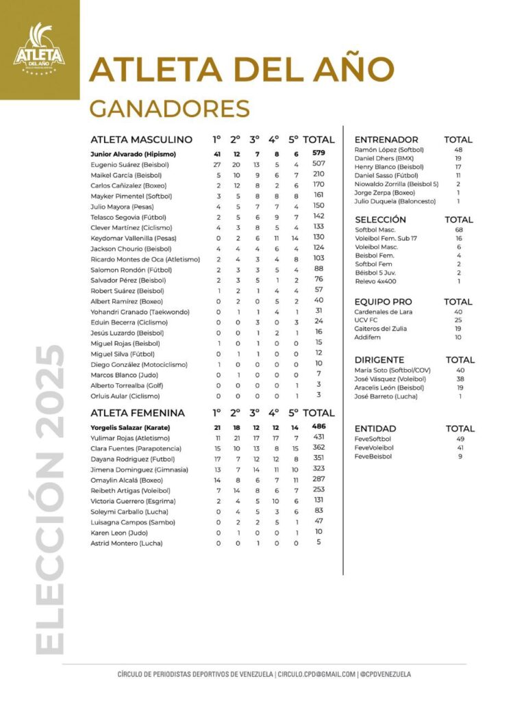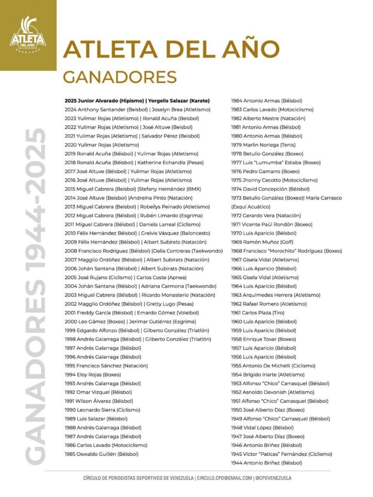 Alvarado le ganó la votación el beisbolista Eugenio Suárez, mientras que Salazar prevaleció frente a la triplista Yulimar Rojas.