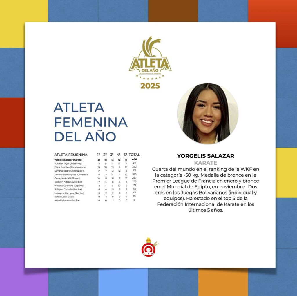 «En su tercera nominación, Yorgelis Salazar finalmente alcanza la máxima distinción del deporte venezolano. En un año en el que tuvo que lidiar con lesiones, terminó como cuarta del mundo en el ranking de la WKF en la categoría -50 kg. Medalla de bronce en la Premier League de Francia en enero y bronce en el Mundial de Egipto, en noviembre. Agregó dos oros en los Juegos Bolivarianos (individual y equipos) y por quinto año seguido cierra en el top 5 de la Federación Internacional de Karate», destacó el CPD.